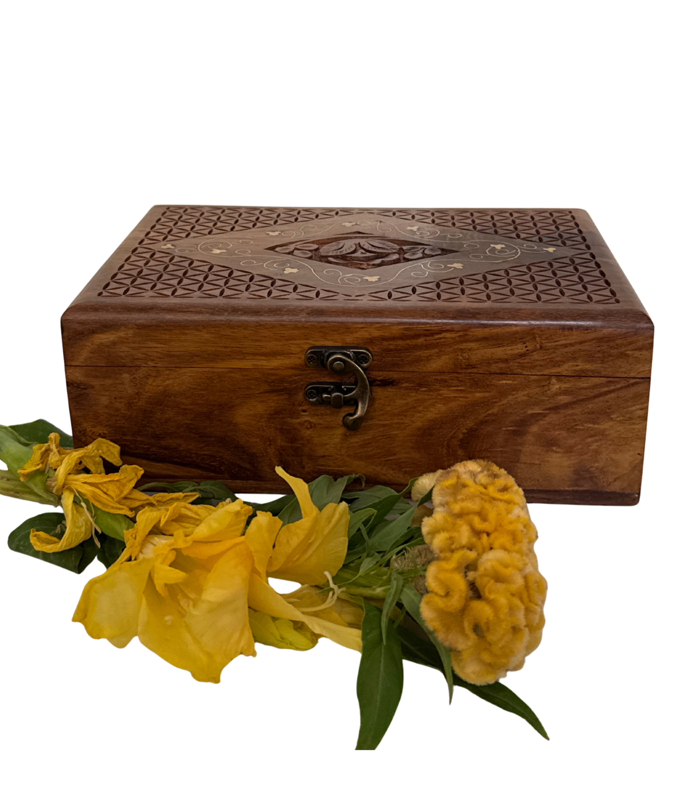 Crafted with hand-cut brass latticework over a wooden body, this box blends durability with decorative elegance.